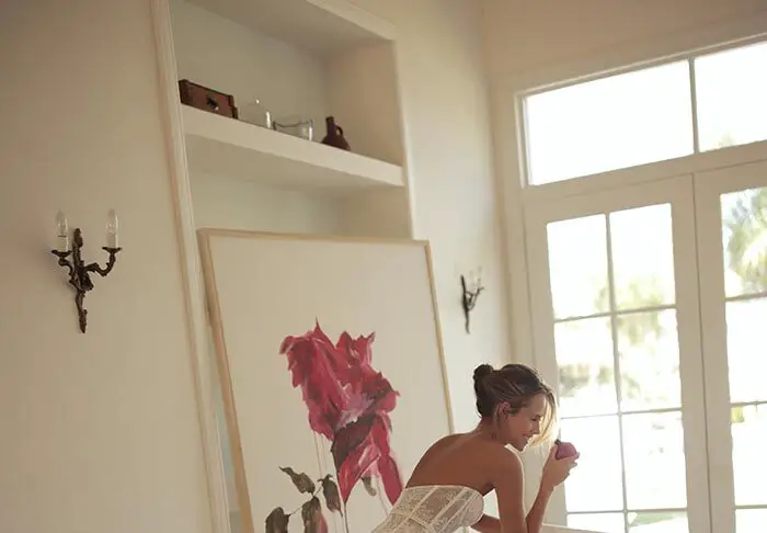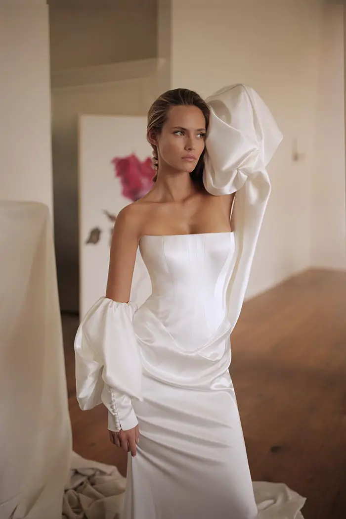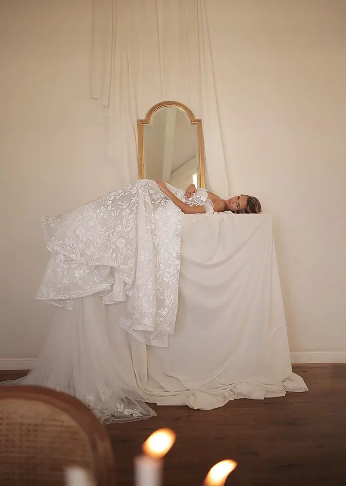 The collection is a symphony of balanced beauty in all its detail and restraint. Crafted with the finest soft silks and intricate French laces, each gown a story of love and elegance. Artful floral motifs dance across the fabrics, while simple silhouettes are elevated with draped details. Built-in corsets provide a structured yet comfortable fit, ensuring that every bride feels as stunning as she looks. The collection offers a new standard of minimalist elegance, showcasing the art of subtlety and sophistication.